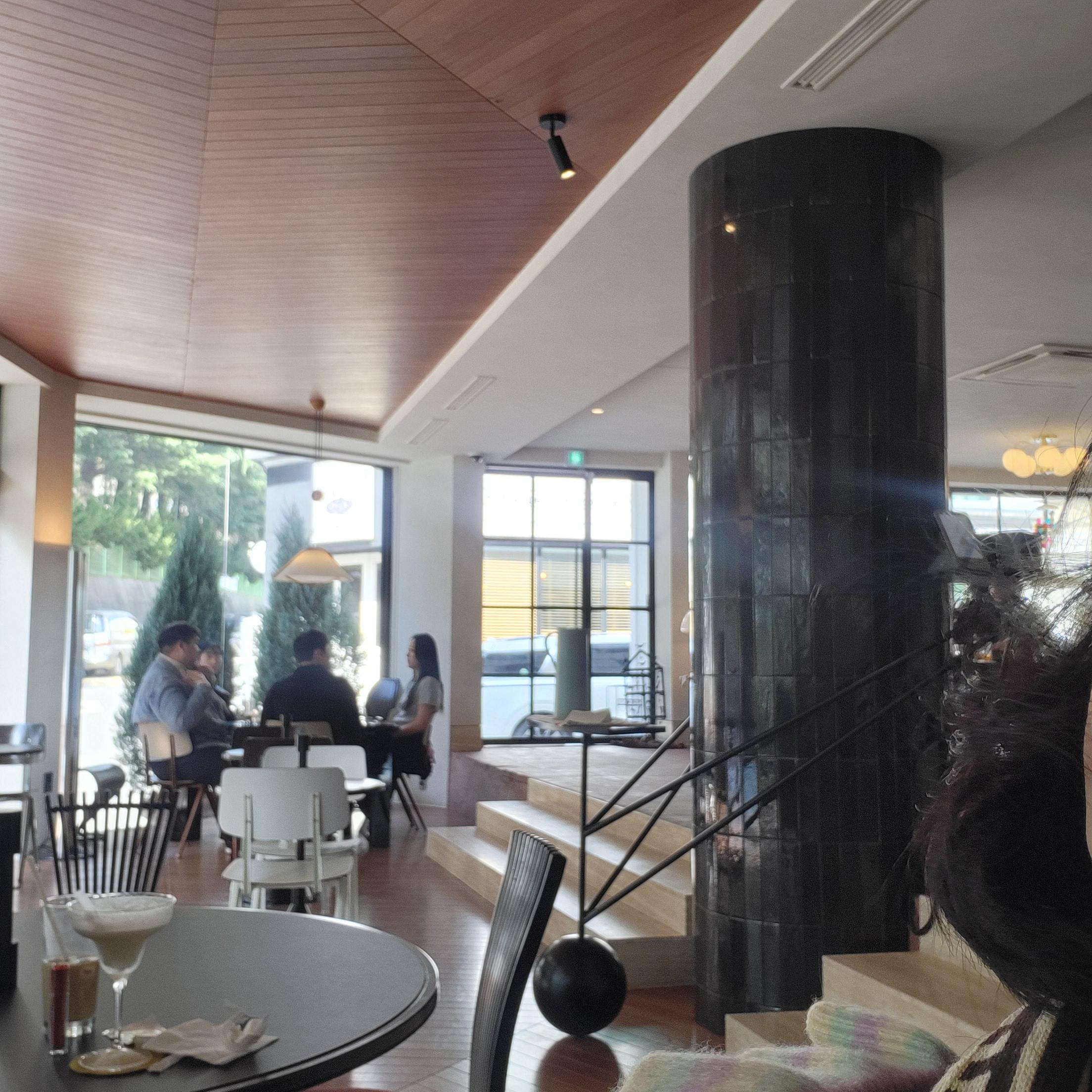 카페 내부로 들어서면, 따뜻한 우드톤 가구와 감각적인 인테리어가 눈에 띈다