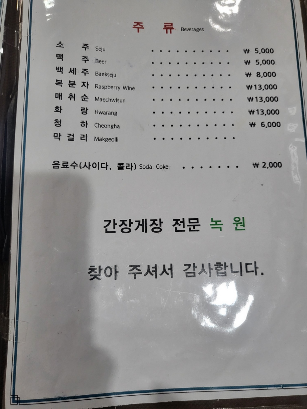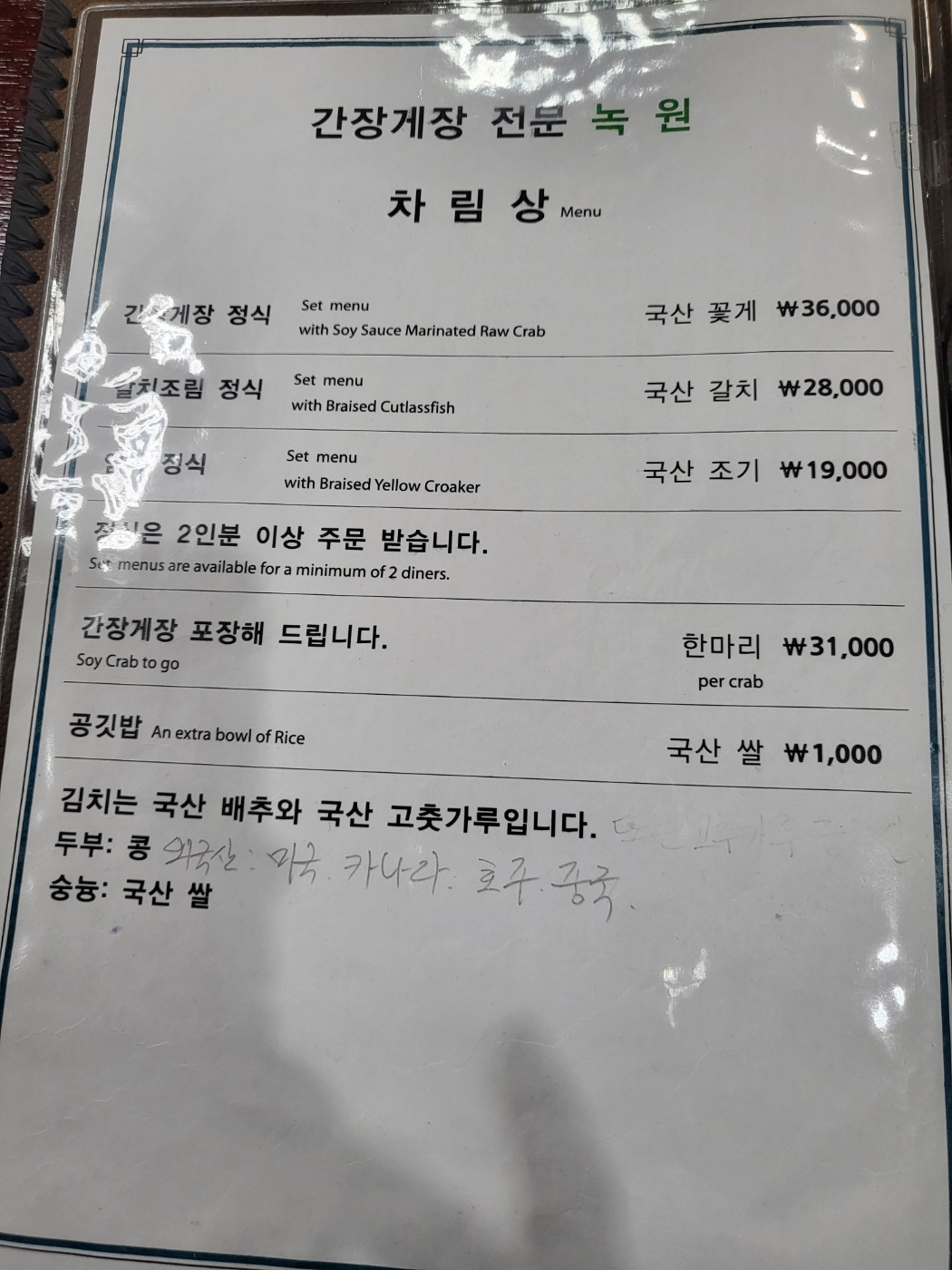 [녹원간장게장의 메뉴]
