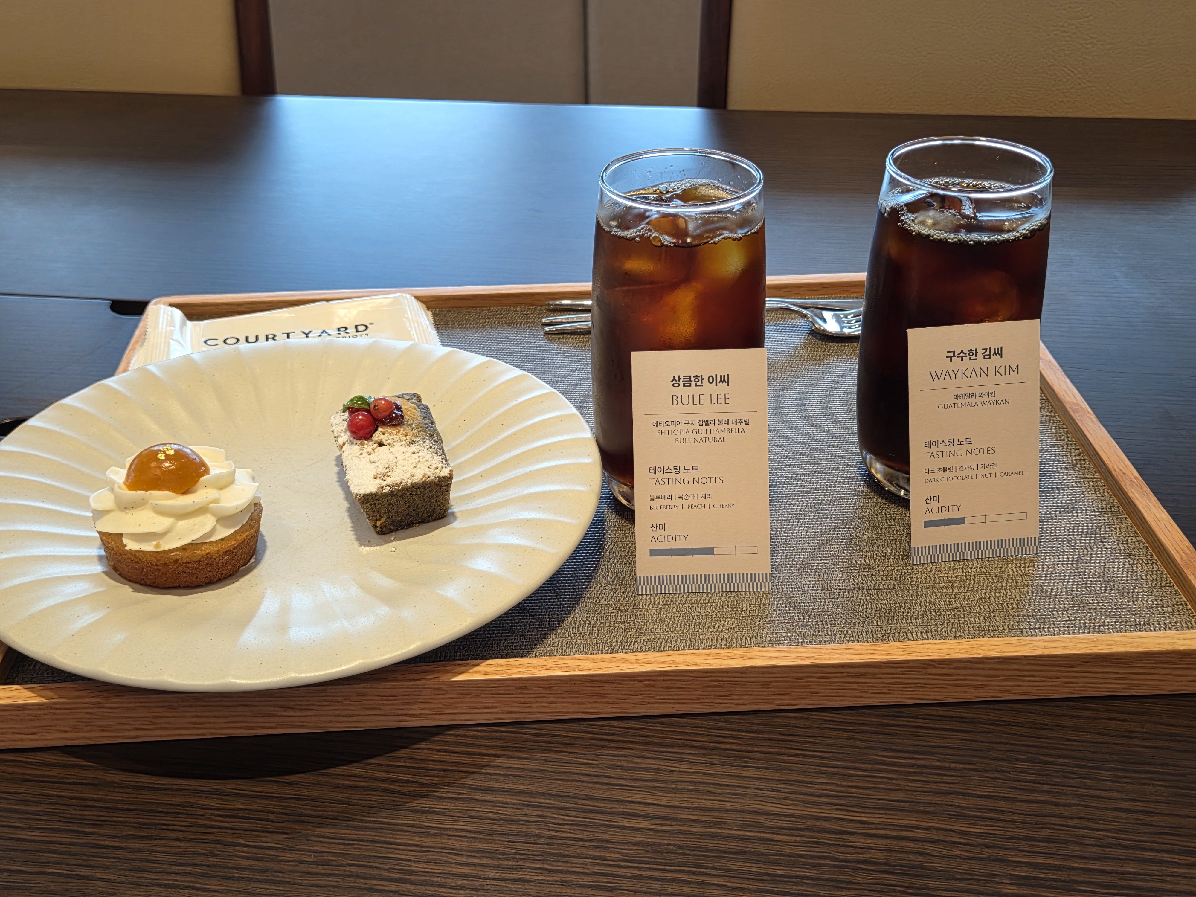 위의 사진은 이 카페에서 예약을 통해서만 주문할 수 있는 프로모션 디저트와 웰컴드링크 세트("무릉도원")입니다.