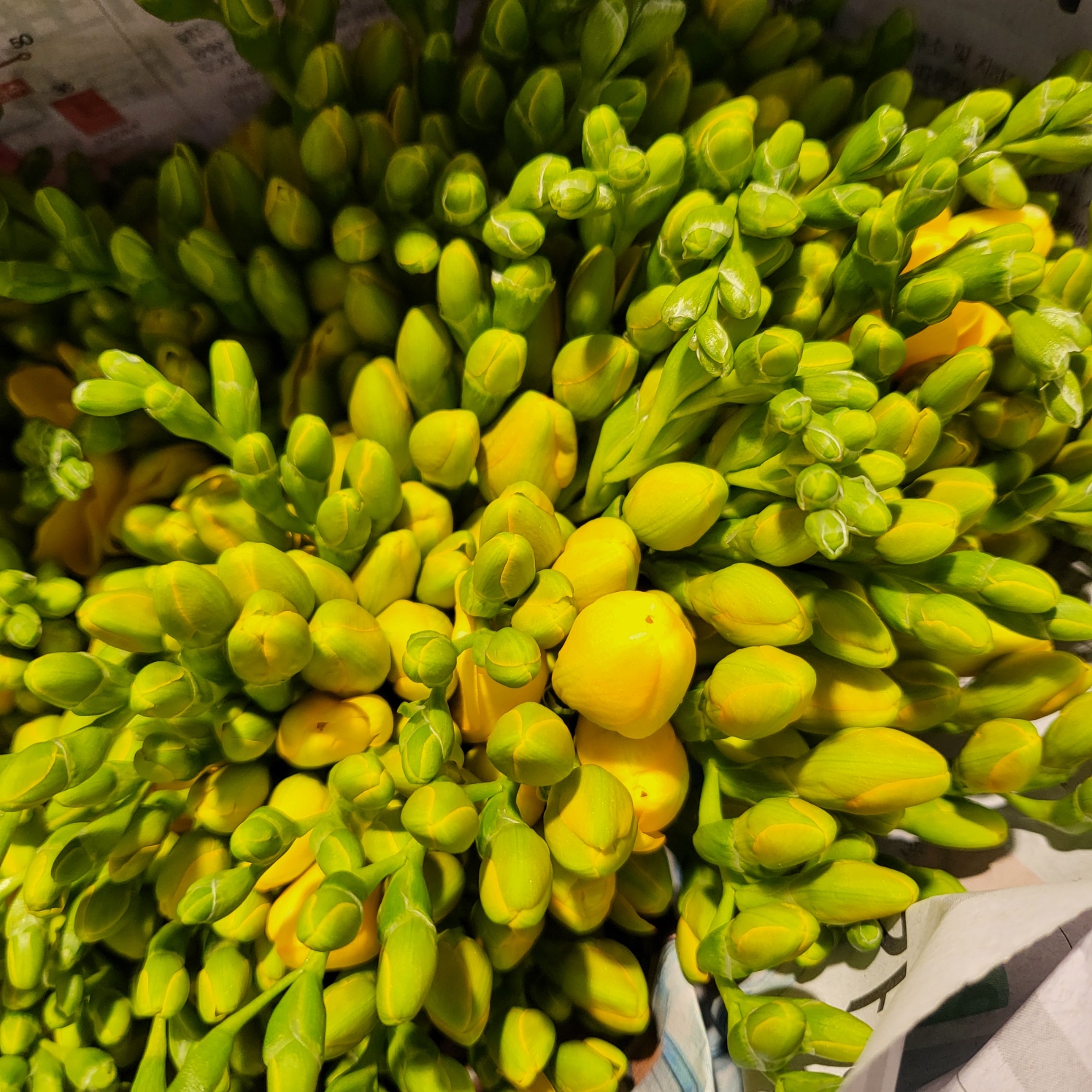 봉오리 상태의 피기 전 프리지아를 2단 구매하였습니다.