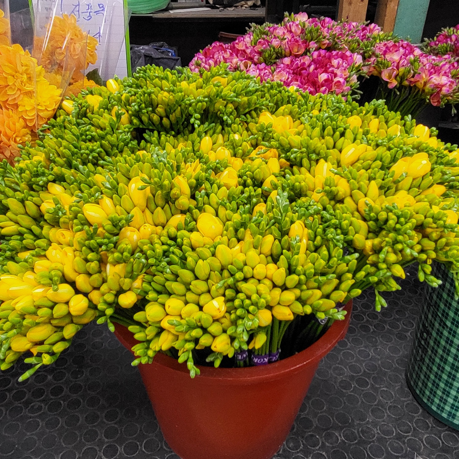 1단에는 프리지아 5묶음이 있고