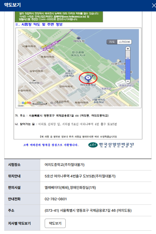 집 근처에 있는 여의도 중학교에서 치러졌고, 시험 전날 한국산업인력공단(Q-Net)으로부터 고사장과 교실 안내 카카오톡을 받았습니다. 교통도 편리하고, 익숙한 지역인데다 많은 사람들이 그 곳으로 향하고 있어 찾아가는데에는 전혀 문제가 없었습니다.
