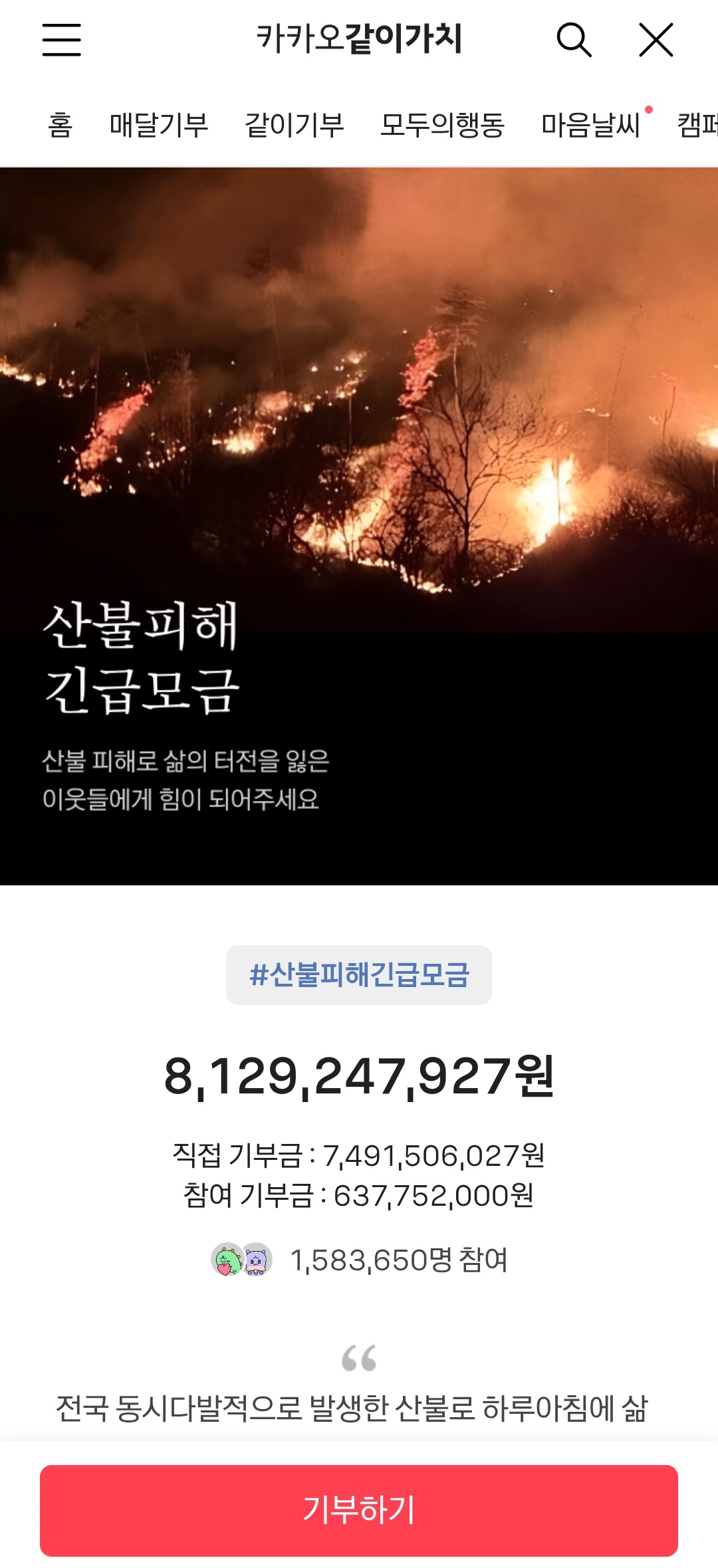 산불 피해로 어려움을 겪는 지역 주민들과 복구 작업을 돕기 위한 긴급 모금 캠페인이 현재 카카오같이가치에서 진행 중입니다.