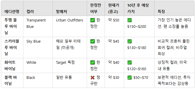 투명 블루 바이닐: Urban Outfitters에서 독점 발매된 이 에디션은 한정판으로 제작되어 희소성이 높습니다. 현재 중고 시장에서 약 $50 정도에 거래되고 있으며, 10년 후에는 $150~$200의 가치 상승이 예상됩니다.